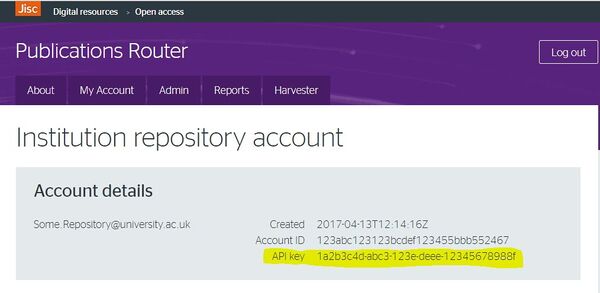This needs to be updated with your PubRouter API Key which is required so that the plugin can retrieve article PDFs and related files for attachment to the Eprint record. The API Key will be available once you have a PubRouter account; it is displayed at the top of your Account page - see highlighted field in screen-shot below (it contains dummy values):