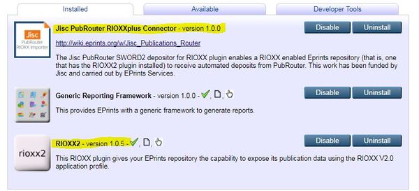 • Jisc PubRouter RIOXXplus Connector plugin for Eprints repositories that have the RIOXX2 plugin installed and enabled. This will populate the additional RIOXX fields with meta-data and will also populate other fields that the basic connection has to work-around. It also attaches document files where available. You will need to install this plugin from Eprints Bazaar and configure it - see further details below.